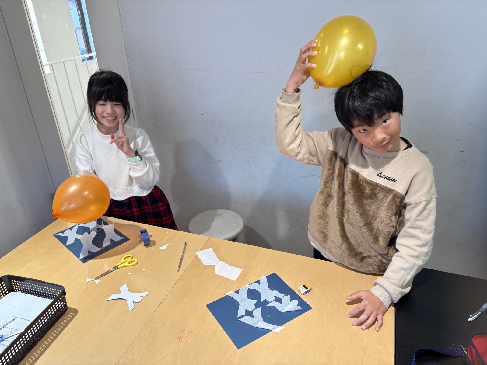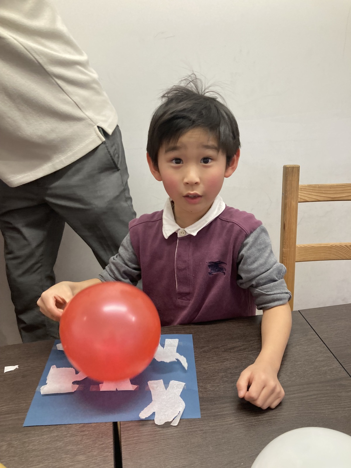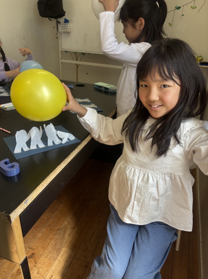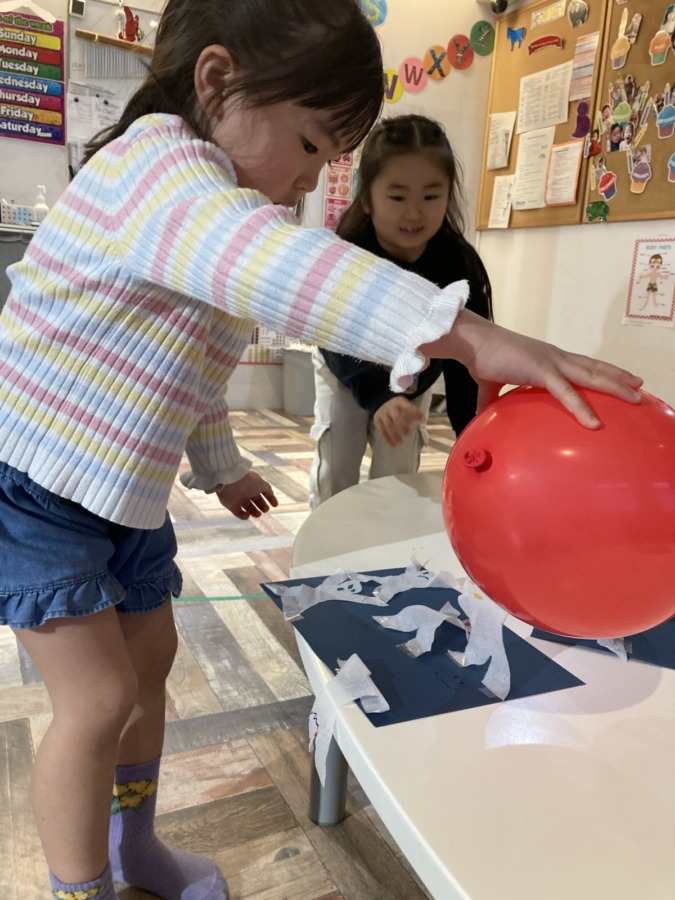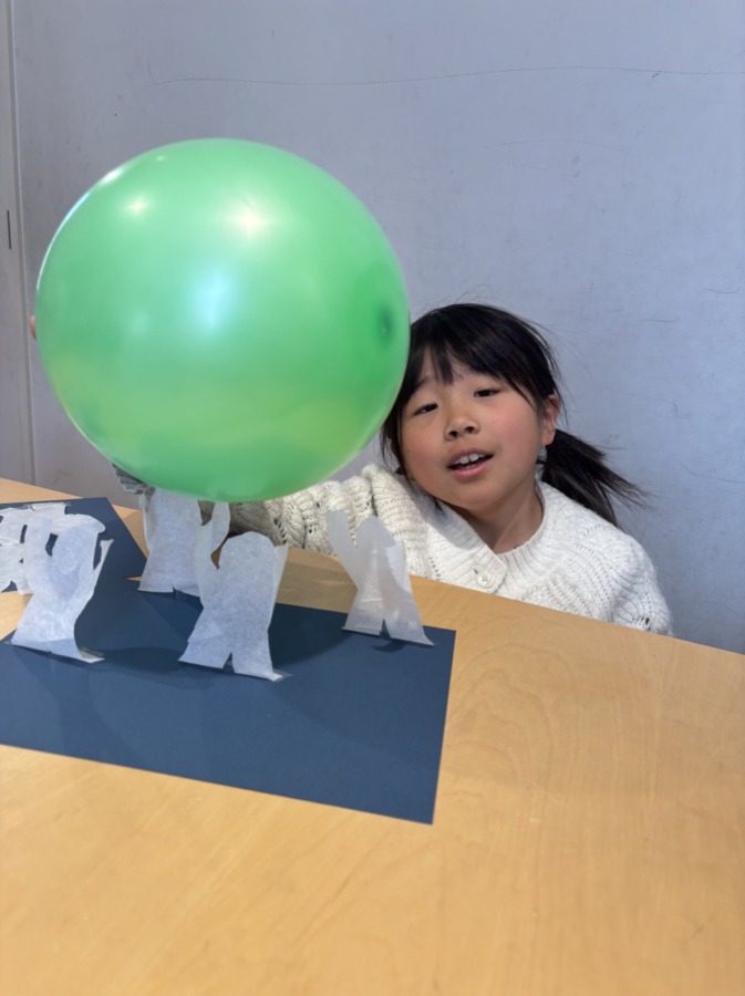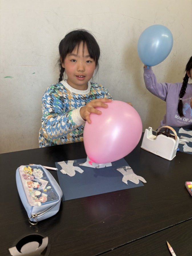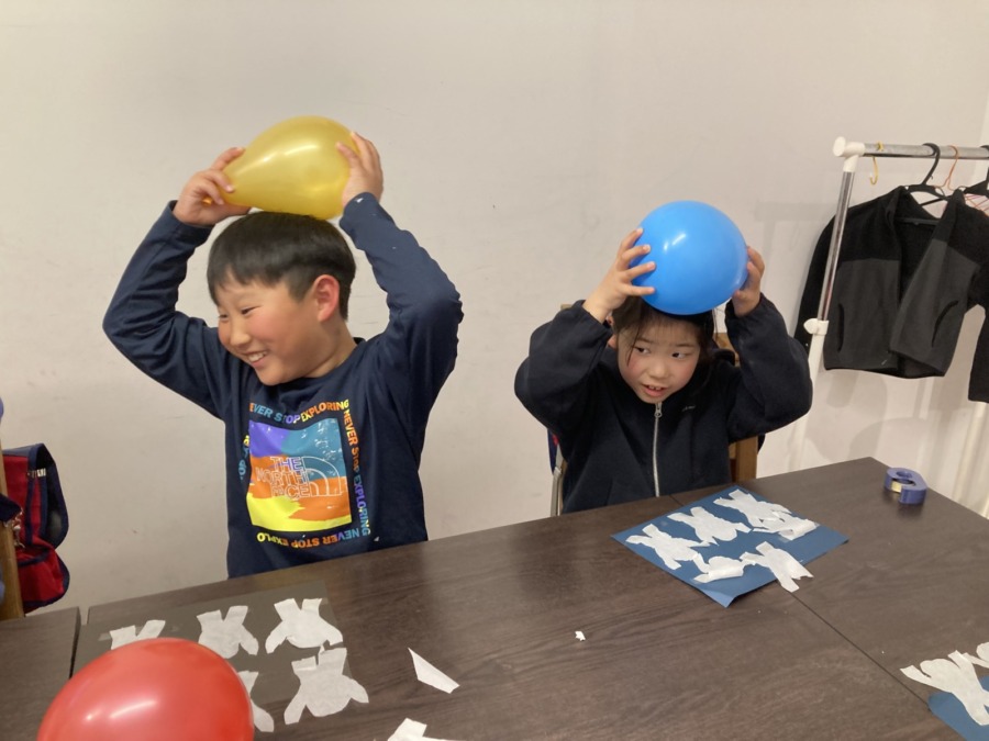 Blog 2026.03.21 Science 今週のSPAはScience! まず画用紙に人型に切ったティッシュを貼ります。髪で擦って静電気を起こした風船をその人型に近づけると、人型が踊り出します。 静電気を使ったおもしろい実験でしたね!ノリノリな音楽で楽しみました! ◀ ブログ一覧へ