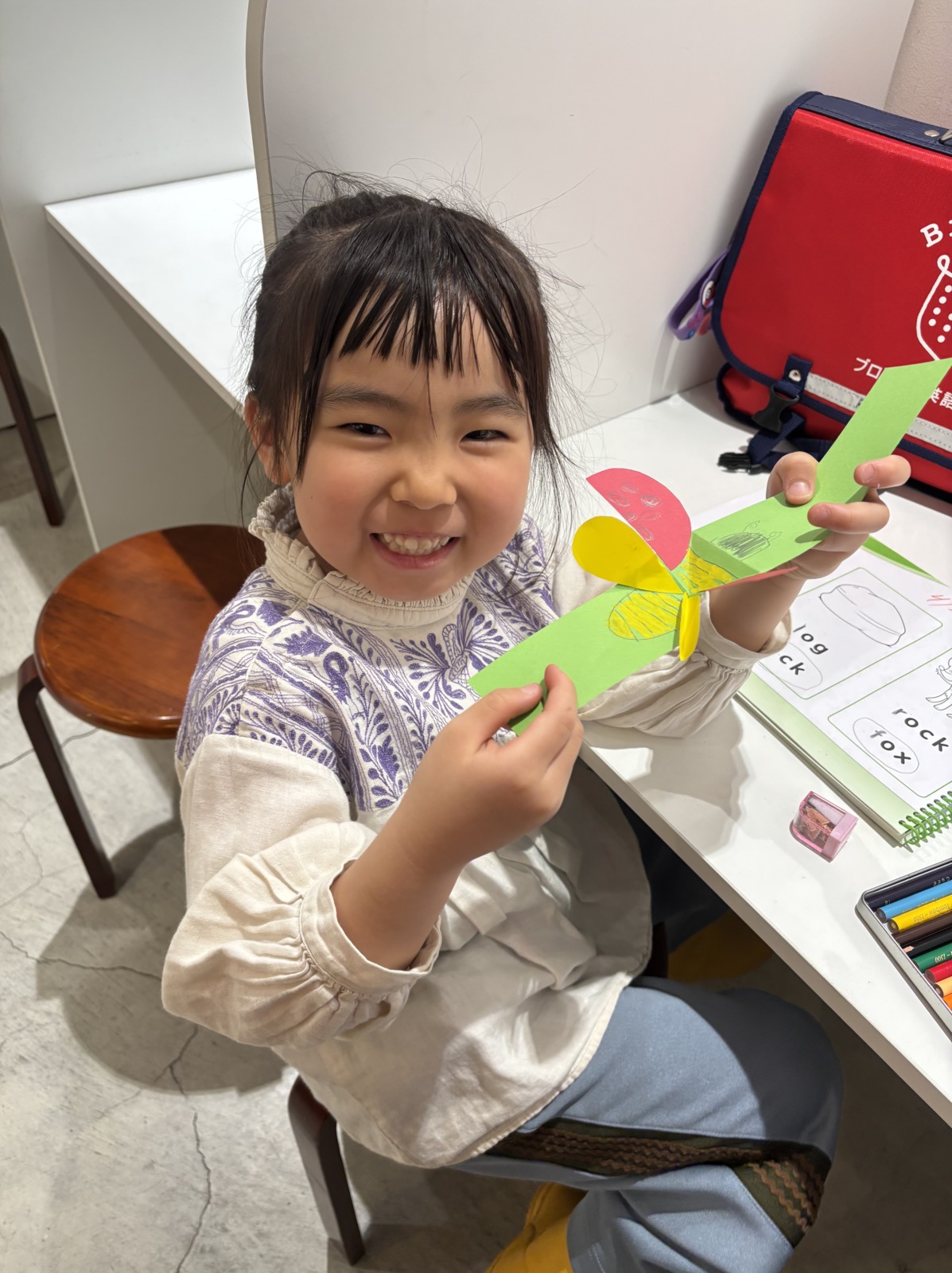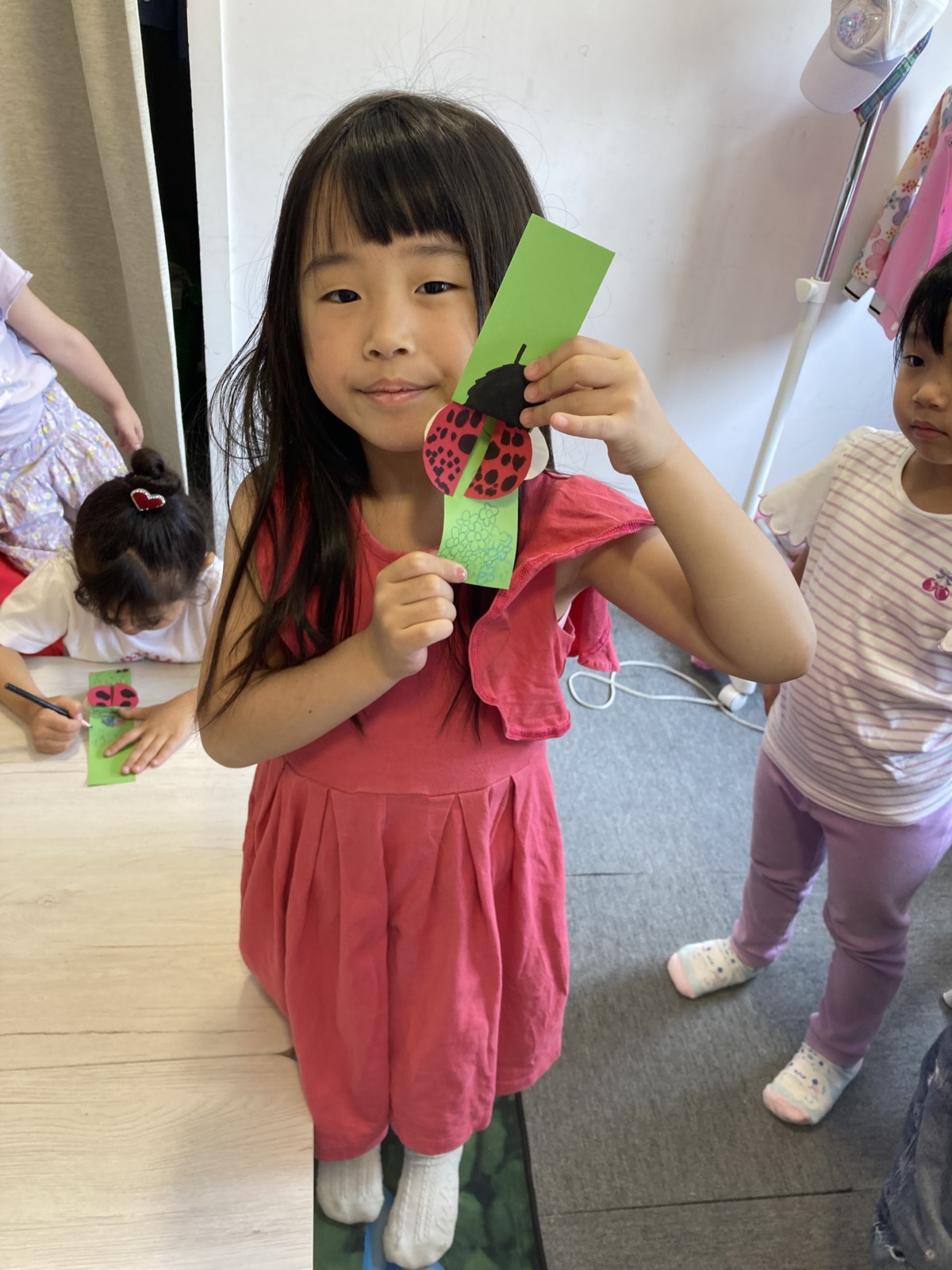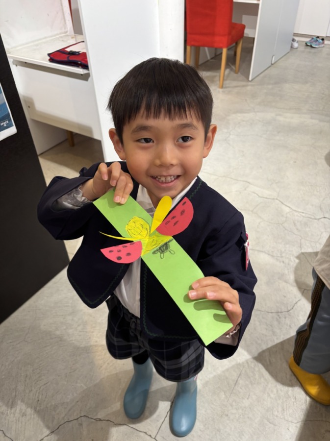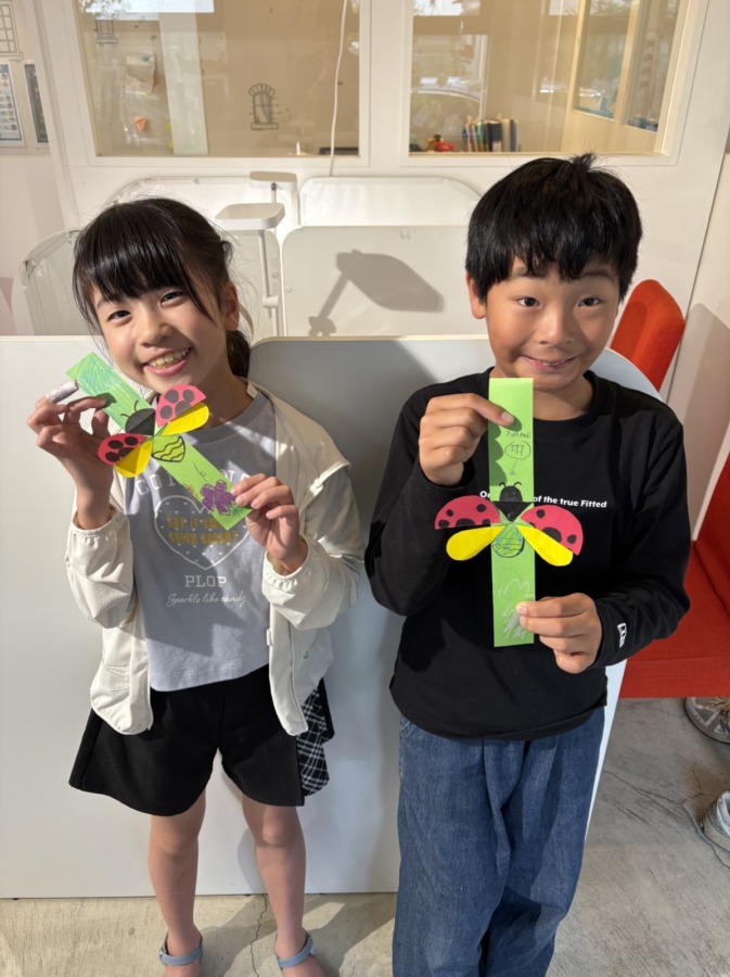Blog 2026.04.25 Craft 今月のSPAはcraftレッスン! 画用紙と折り紙を使ってLady bugを作りました😁 折り方や貼る場所が少し難しかったですが、しっかり先生の英語での説明を聞いて作ることができました! 仕掛けがおもしろく、何度も引っ張って見せてくれましたよ❣ . ◀ ブログ一覧へ